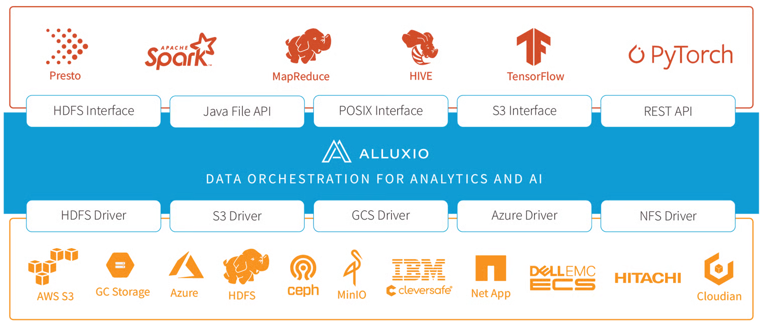 Alluxio 是一个分布式数据编排系统，可将您的数据更靠近您的计算框架。它充当您的持久存储（如 Amazon S3、HDFS 或 Azure Blob 存储）和计算框架（如 Spark、Presto 和 PyTorch）之间的缓存层。