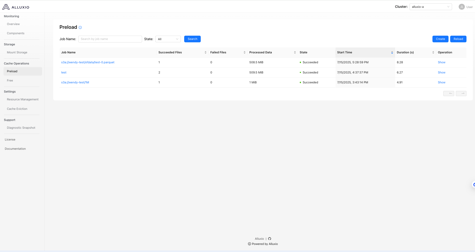 The Preload page lists all previously submitted preload jobs. Each row in the table includes important details such as job status and the number of files processed. The filter box at the top of the table allows users to quickly locate specific jobs. For more details about a job, click the Show button. To create a new preload job, click the Create button in the top-right corner.