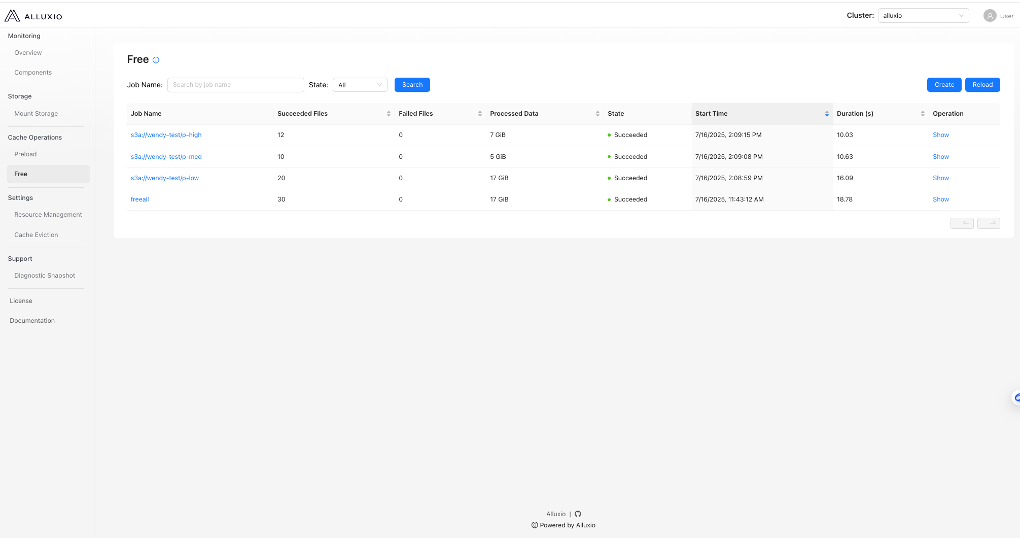Similar to Preload, the Free page displays all submitted free jobs. Users can also click the Create button to start a new free job.
