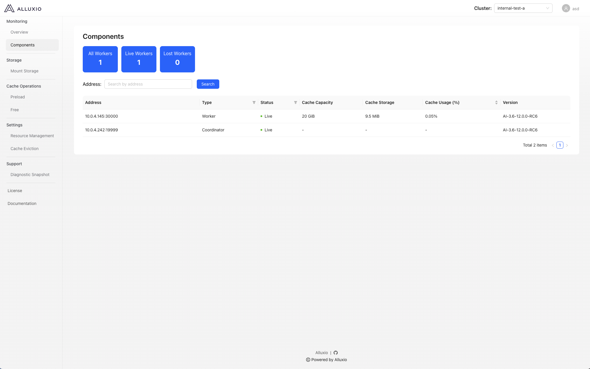 The Component Status page shows detailed status for each individual cluster component. When issues occur, users can use this page to identify faulty components and retrieve information such as the component's IP address, current cache usage, the version it's running, etc. Each table includes a filter box, allowing users to quickly narrow down the data to what they’re interested in.