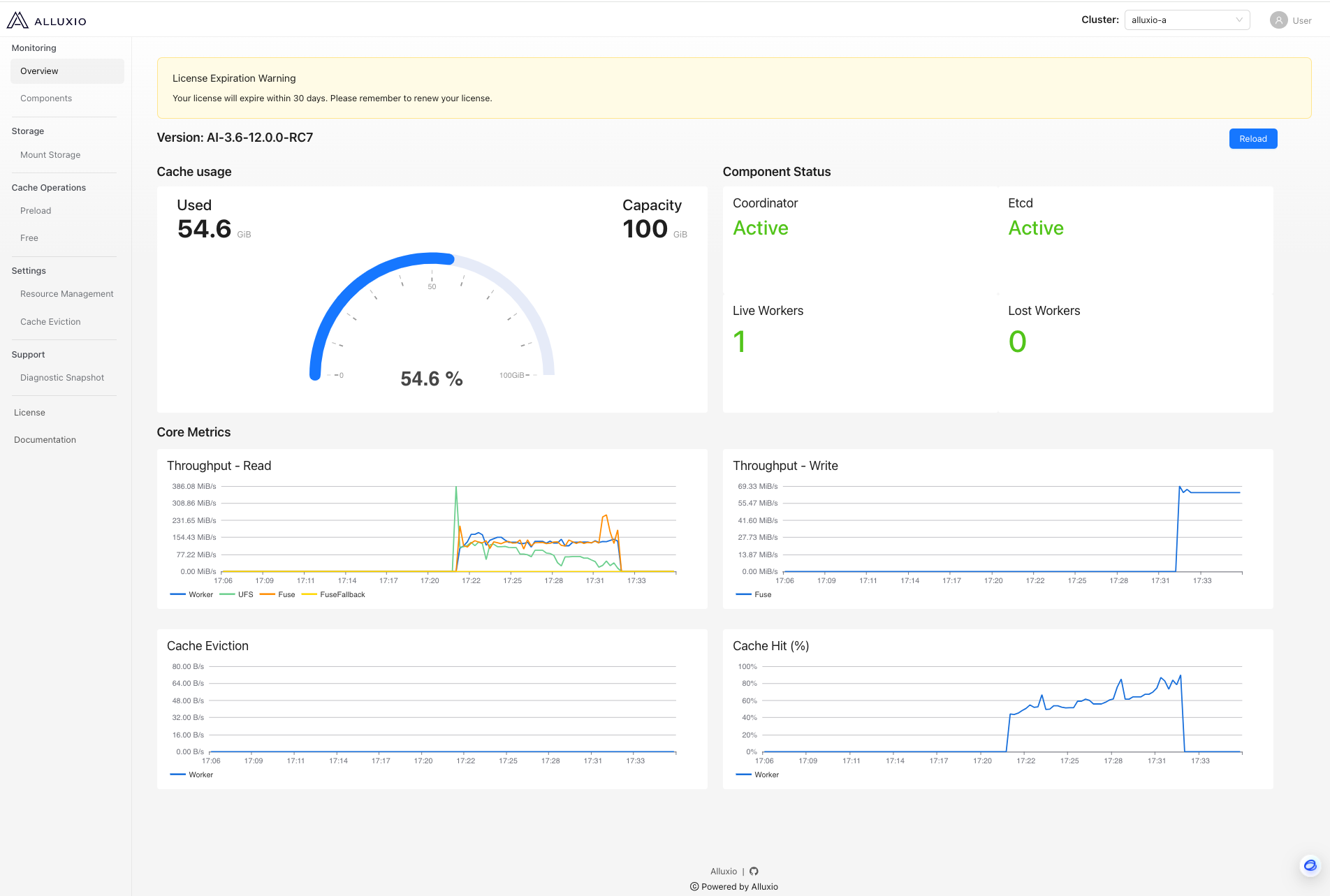 The Overview page provides a summary of the cluster’s status. Users can quickly get a high-level understanding of the cluster health by reviewing key information such as total capacity, used capacity, and the status of coordinators and workers — including how many workers are currently live or lost. It also visualizes key metrics like Read/Write Throughput, Cache Eviction Rate, and Cache Hit Rate.
