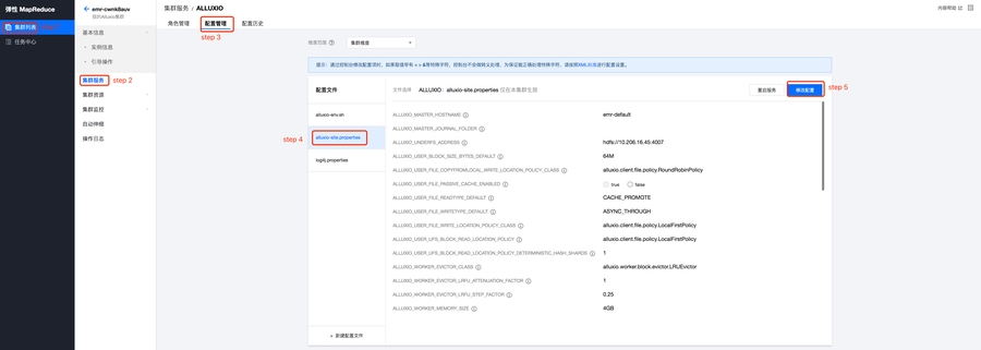 创建了一个带Alluxio组件的腾讯云EMR,默认会把HDFS挂载到Alluxio上,并使用内存作为单层level0存储。如果有需要更改更符合业务特性的多级存储,或者其他对应优化项,可以使用配置下发功能来完成相关配置: