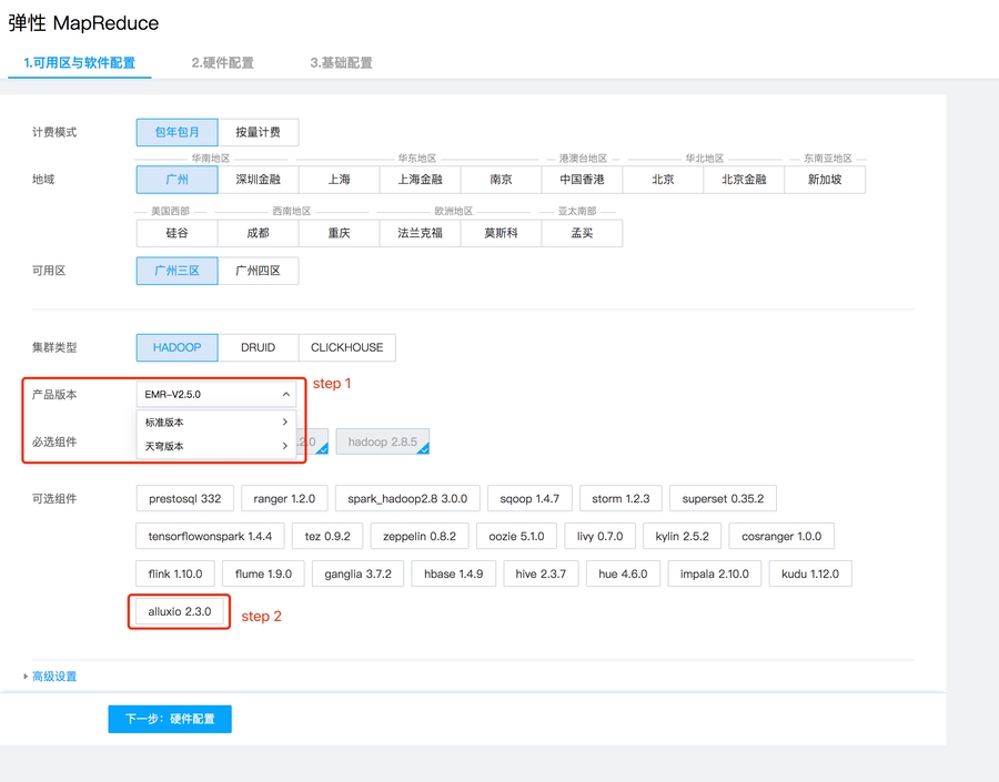 这部分主要说明如何在腾讯云EMR上创建开箱即用的Alluxio集群。EMR提供了使用WEB购买页创建和API创建两种方式来构建集群: