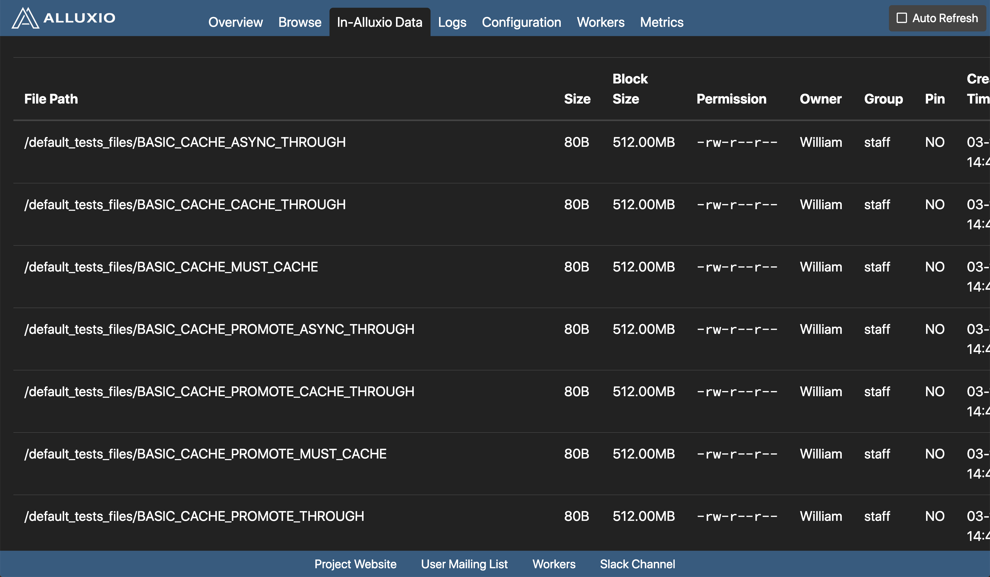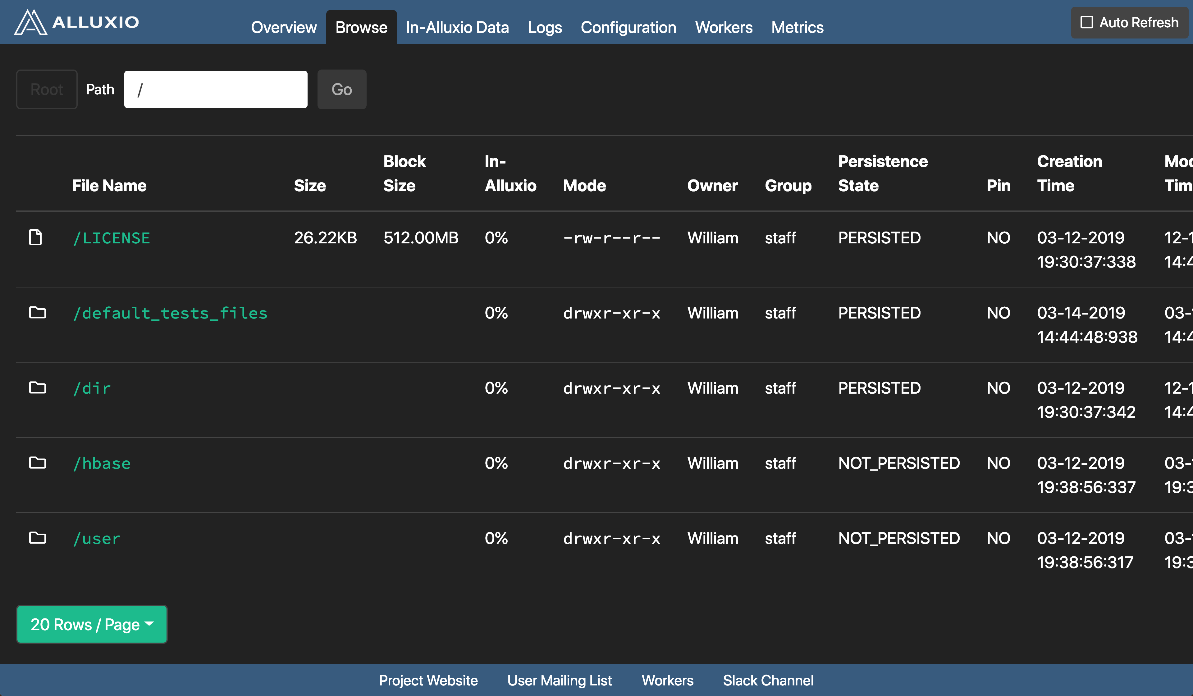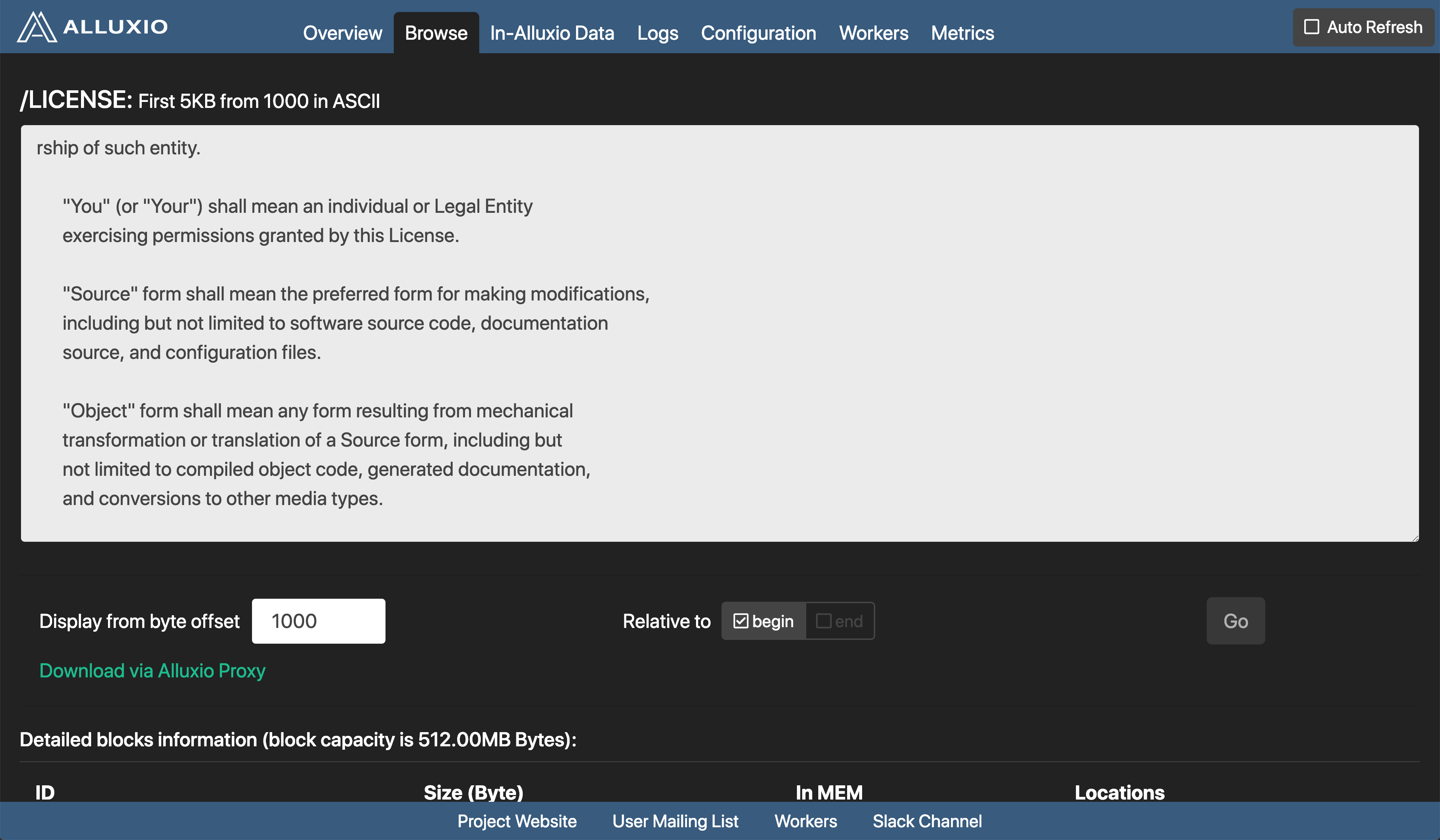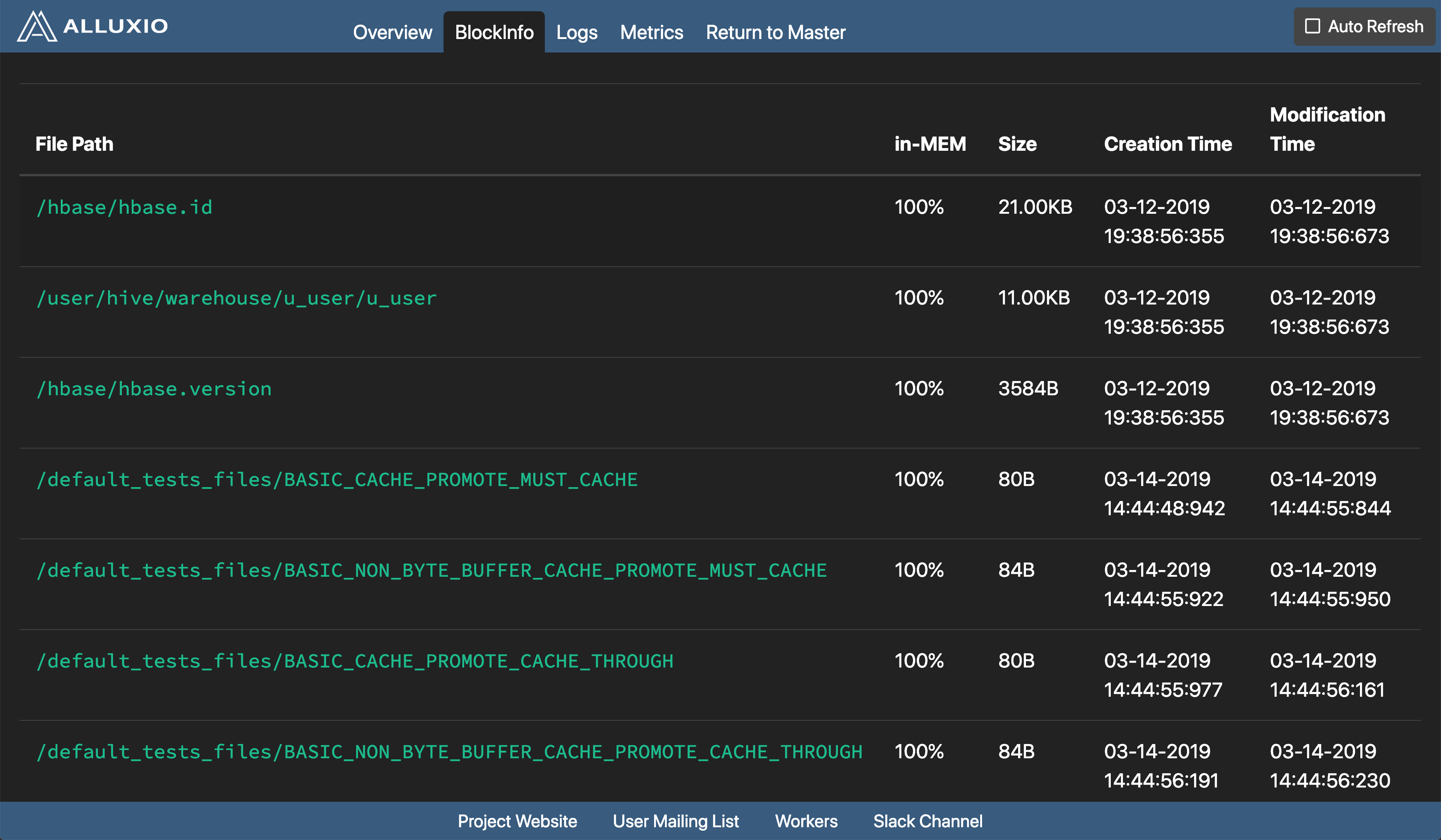 在块信息页面，可以看到worker上的文件，以及其他信息，如：文件大小和文件所在的存储层。当你点击文件时，可以看 到文件的所有块信息。
