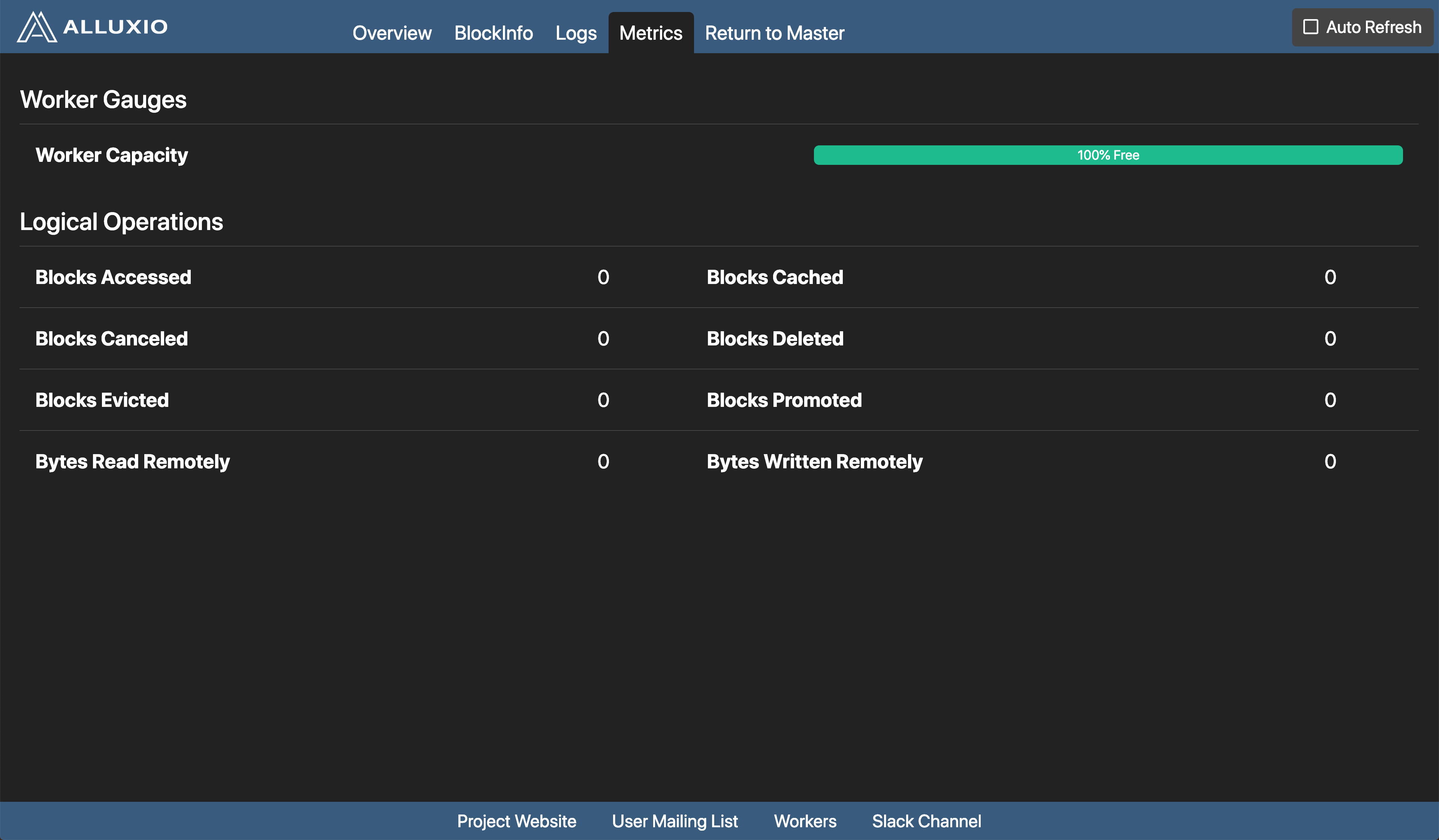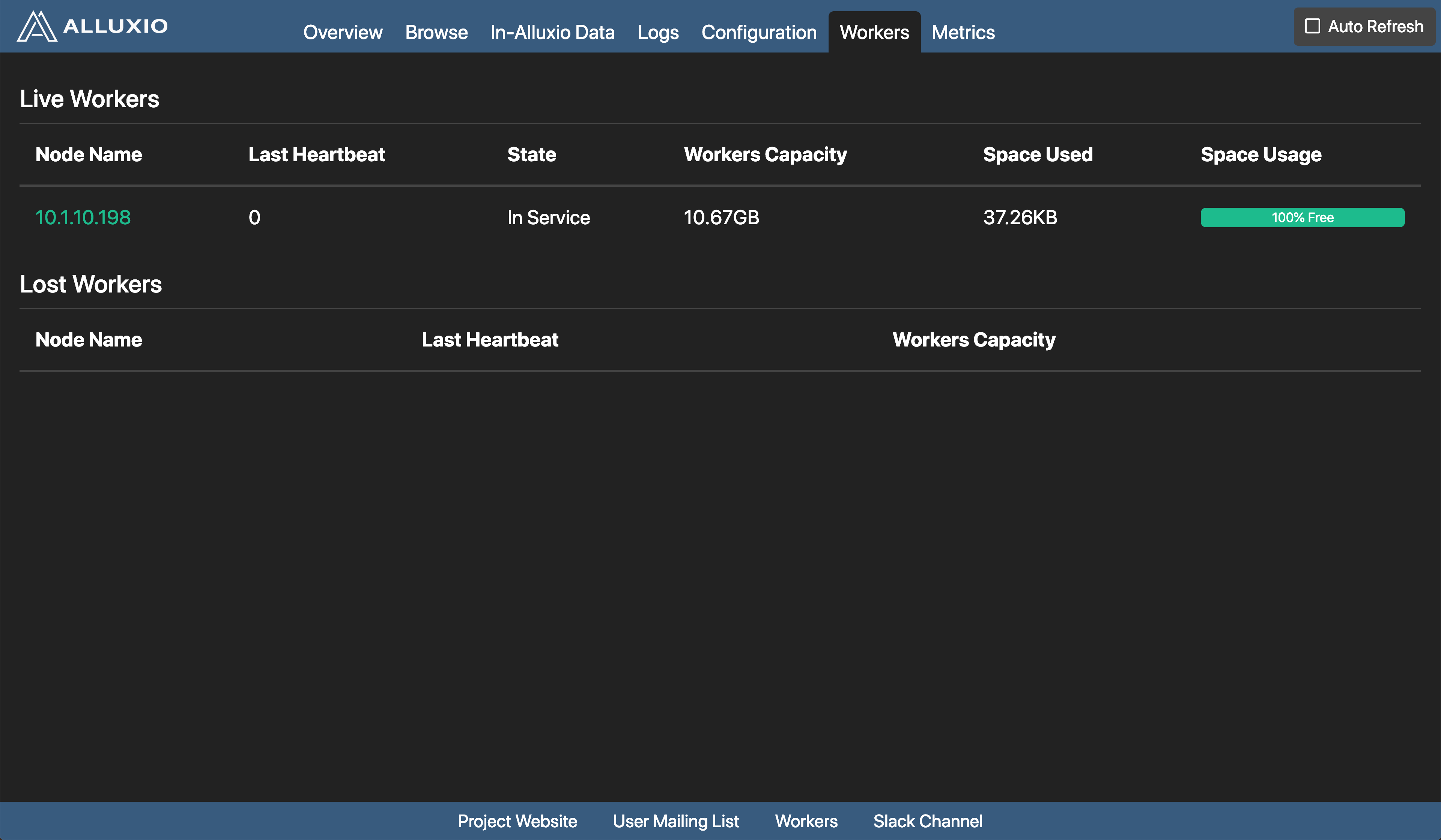 master也显示了系统中所有已知的Alluxio worker。点击"Workers"选项卡即可查看。