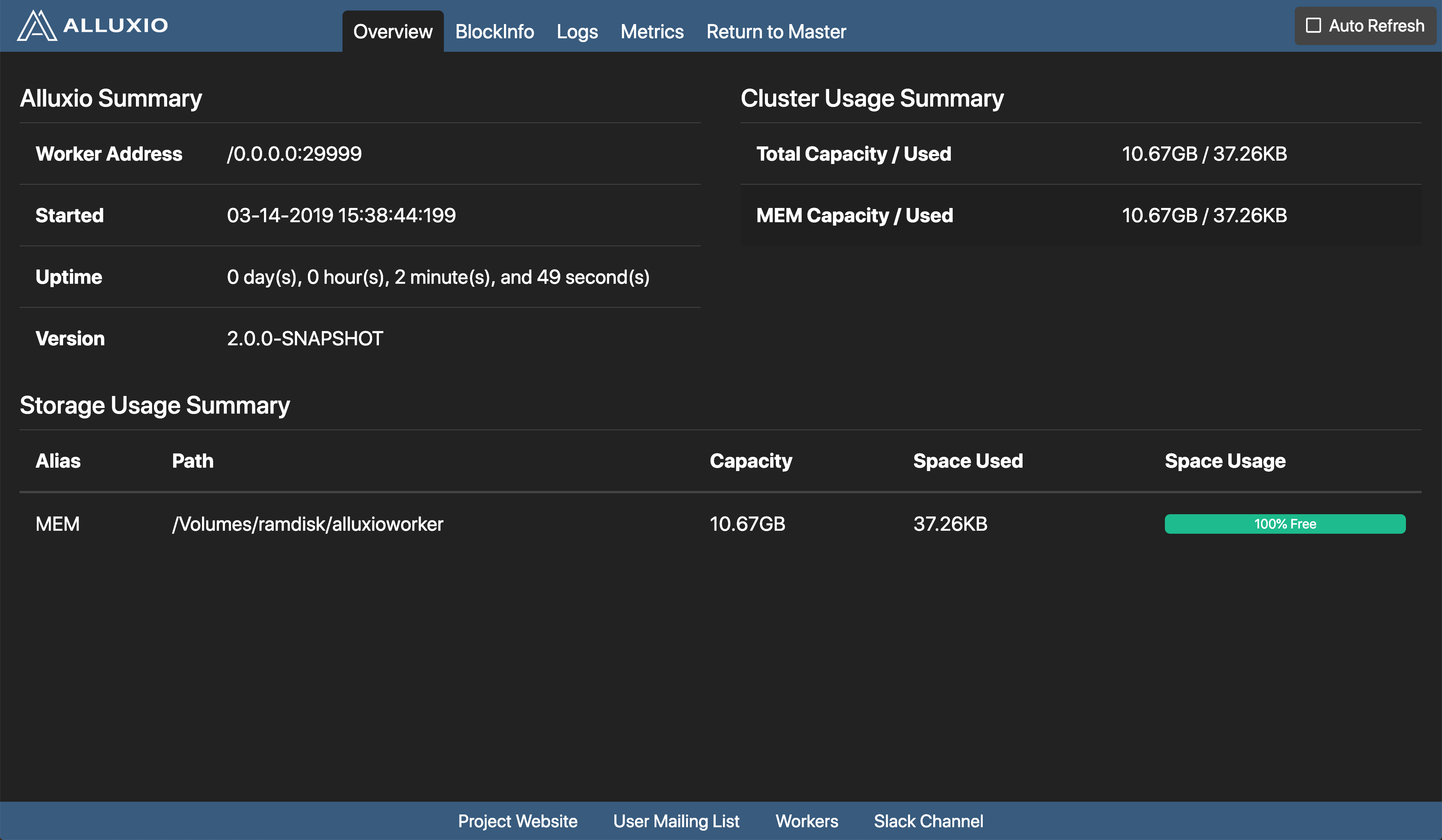 Alluxio worker的主页和Alluxio master类似，但是显示的是单个worker的特定信息。因此，它有类似的部分： **Worker 概要**, **存储使用概要**, **分层存储详细信息**.