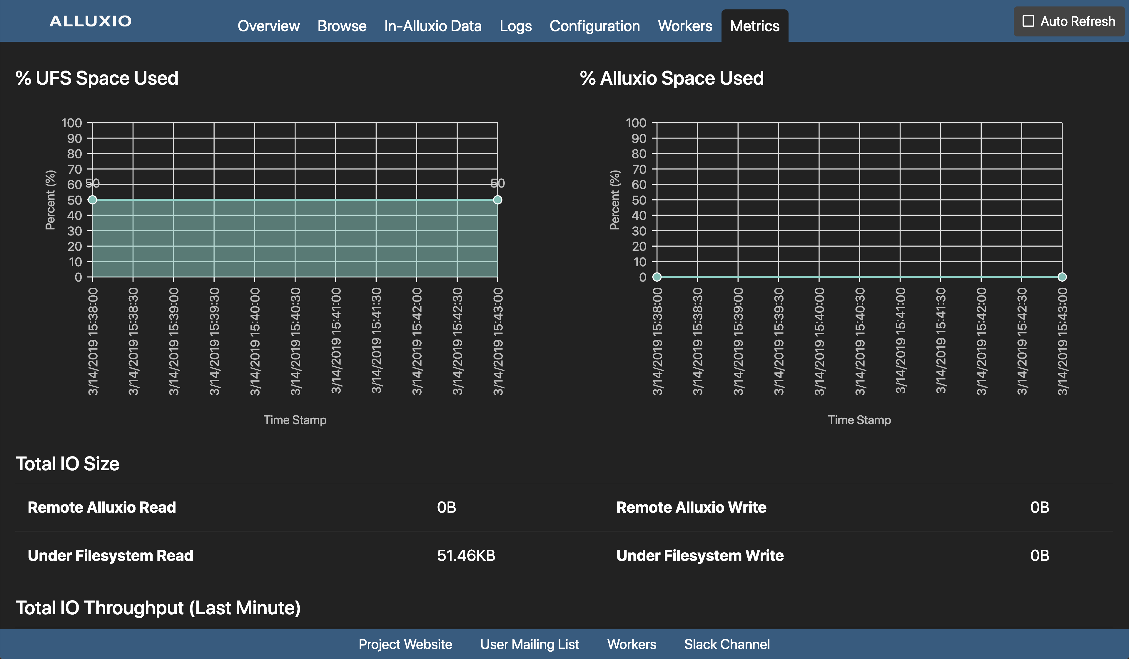 * **集群使用概要** Alluxio存储信息和底层存储信息。Alluxio的存储使用可以接近100%，但底层的存储使用不应该接近100%。