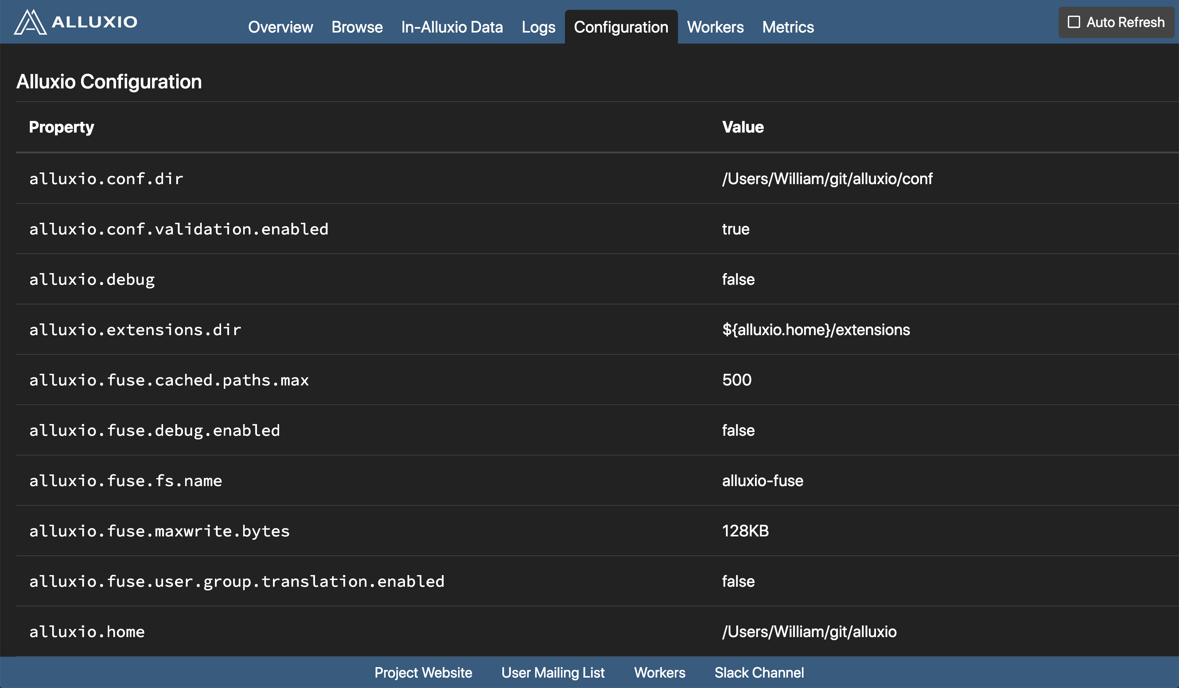 * **Alluxio配置** 所有Alluxio配置的属性和设定值的映射。